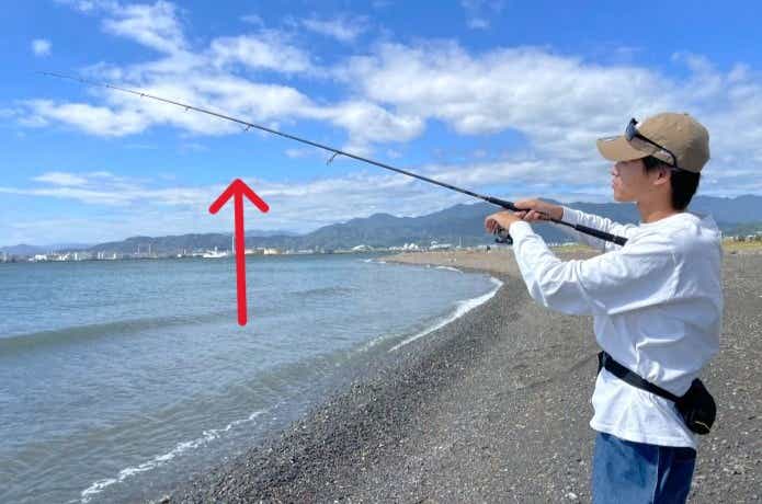 サーフでエギをしっかり跳ね上げるには、竿を高めの位置に構え、ティップで上方向に弾くように意識しましょう。