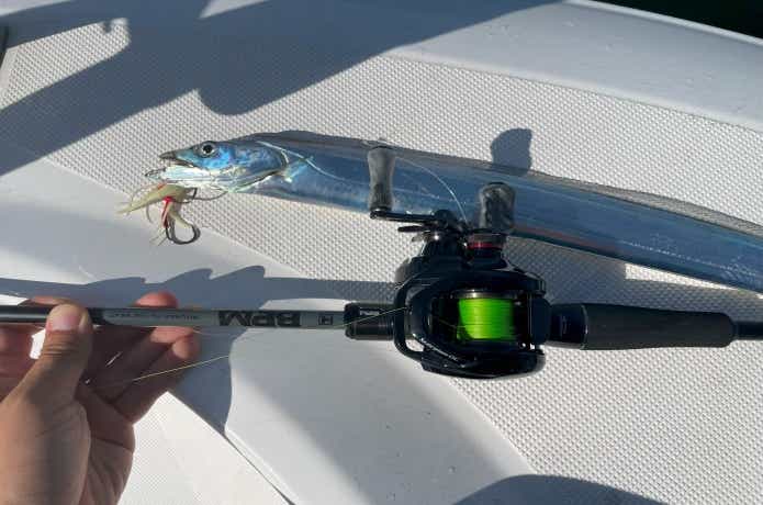 試しに鮭用スプーンへタコベイトを付けてみると、まさかのタチウオ爆釣(笑)。