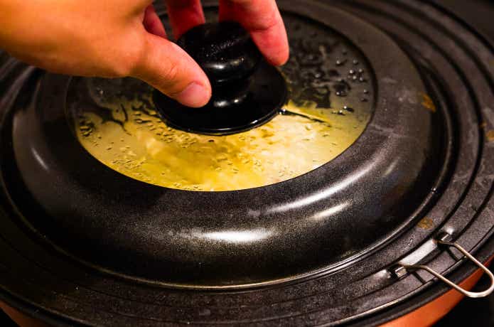 中火のまま、蓋をして2分ほど蒸し焼きに。