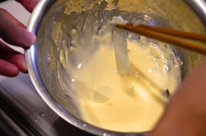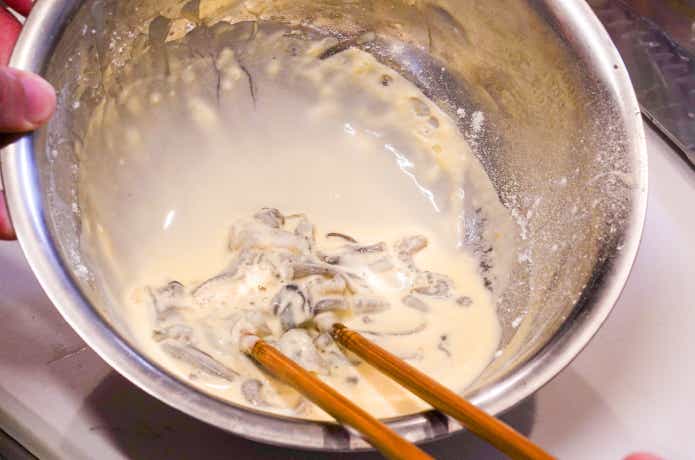 2.天ぷら粉をつくり、たっぷりとまとわせる