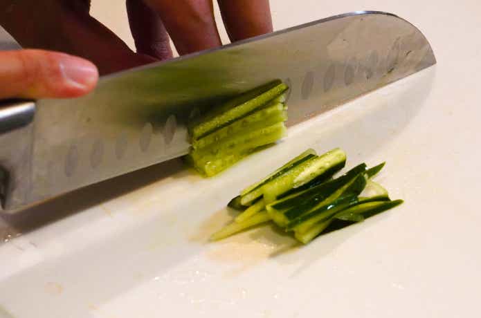 板ずりや塩もみなどの下ごしらえをしたきゅうりと、アオリイカを細切りにしましょう。