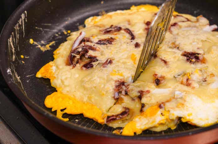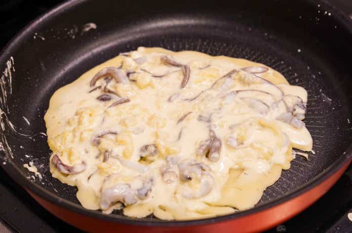 油を引いたフライパンを中火で熱してから、生地を流し込みましょう。