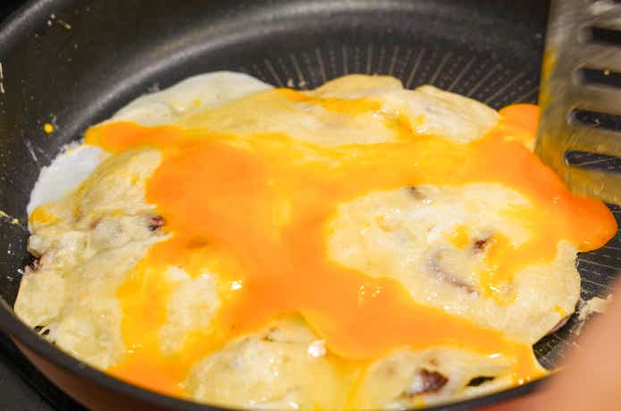 生地の中央に卵を割り入れて、黄身を潰したら生地にまんべんなく伸ばします。