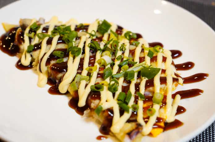 中央に切れ目を入れて折りたたみ、ソースやマヨネーズ、細ねぎをかけてお召し上がりください。