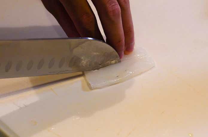 このとき、十字に隠し包丁をいれるとイカが爆発して油跳ねする恐れが軽減します。