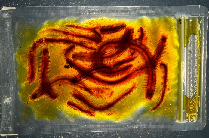 生きたままのイソメを独自開発の特殊保存液(食品添加剤)に漬け込むことで、体液をそのままの状態で保持できるのが特徴となっています。