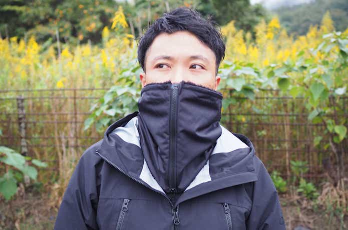 ファスナーを下まで閉じるとネックウォーマー全体がしっかり立つため、鼻先から首元までしっかり覆えるのも特徴。