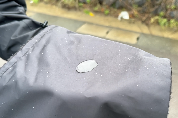 ご覧の通り、水滴をしっかり弾いてくれ、雨の時に何日か釣行しても防水性能は十分なものでした。
