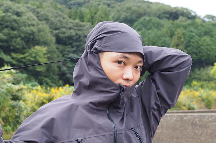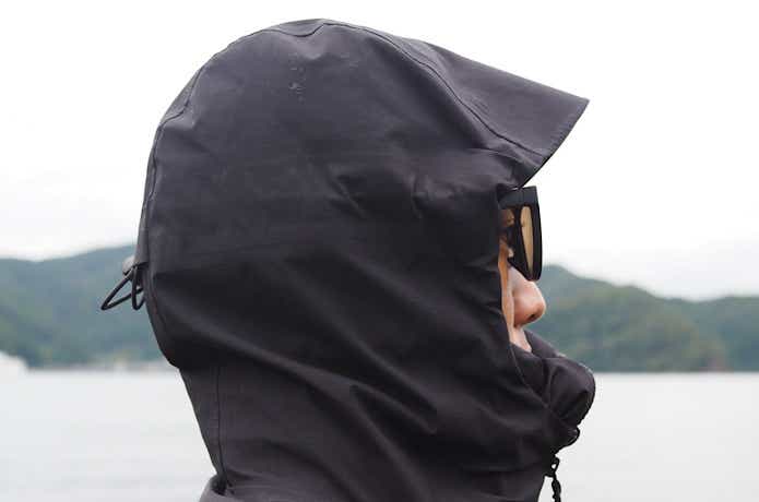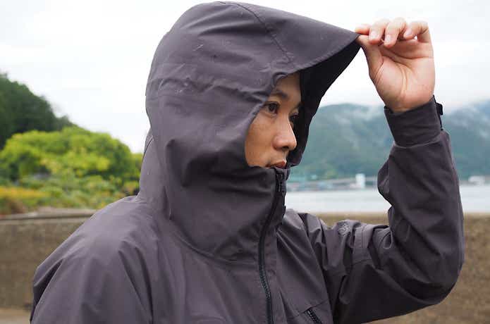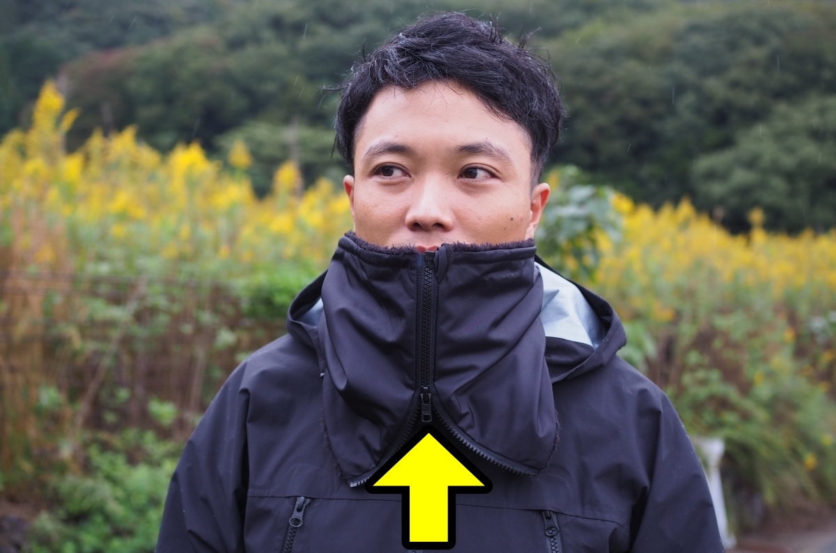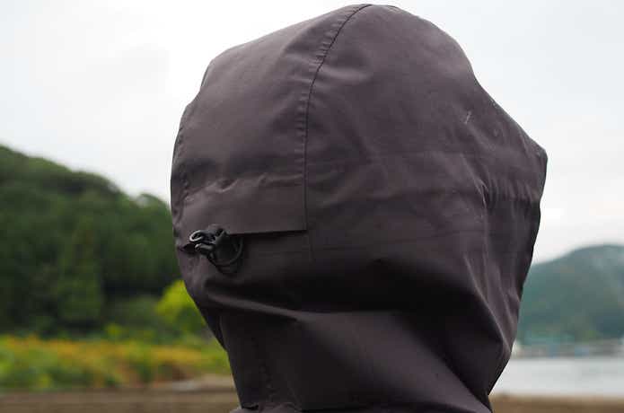 フードは雨の日でもしっかりと前方まで覆え、首元はしっかり立ち上がってガードしてくれます。