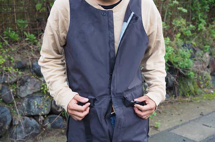 フロント部は、胸元から股下までファスナーが通っており、上下どちらからも開閉することが可能。