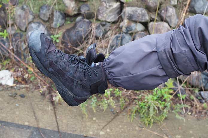 長靴やブーツの上から被せて絞れるため、より防水性が高くなり、裾の汚れも軽減。