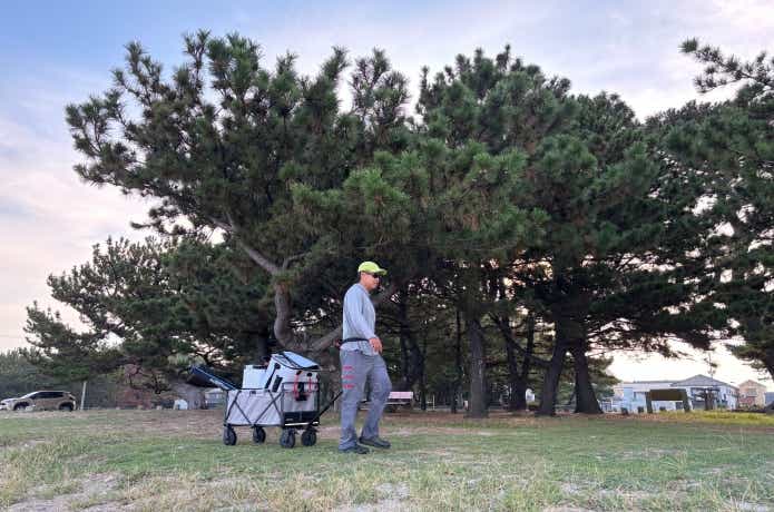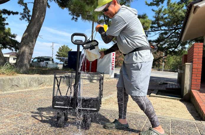 積載重量は最大150kg(急な坂道は75kg)とのことで、試しにTSURI HACK編集長しみけん氏(186cm/75kg)をワゴンに乗せてみました。