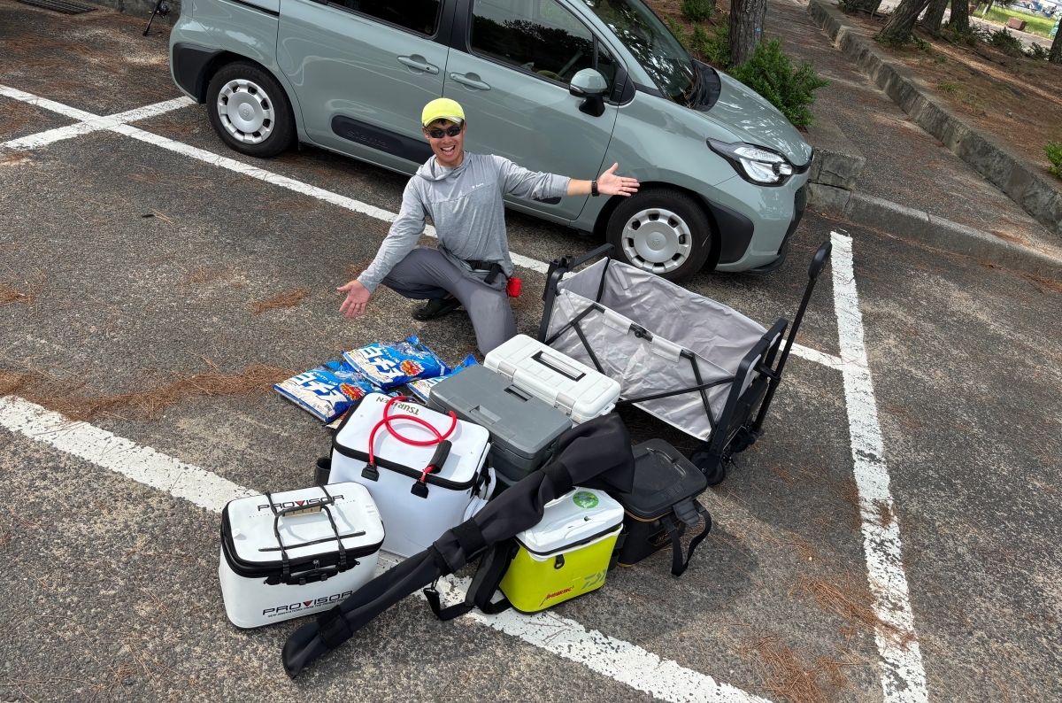 試しに、クーラーボックス2個(27Lと22L)、バッカン4個、ロッドケース、集魚剤5袋を積んでみましょう。