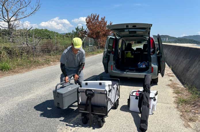 2人分の釣り具とコマセ、大量の飲み物、氷、推定40kgもの荷物をe-Wagon Airに積み込んでいきます。