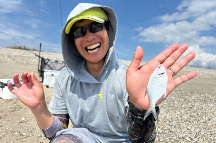 バシッと竿を煽ってアワセたものの、「軽ッ」って思いながらリールを巻いてくると、見慣れない魚をキャッチ!