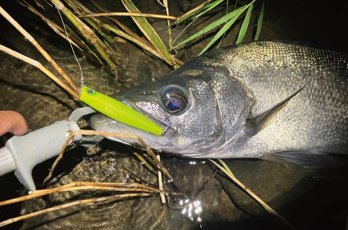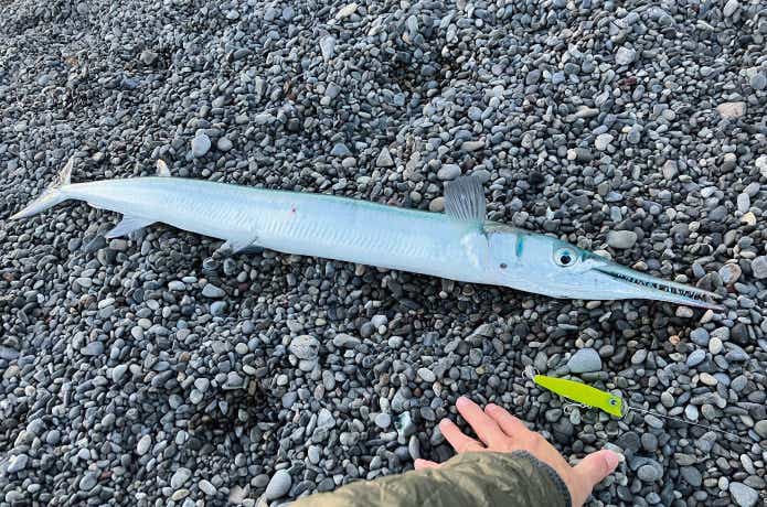 怪しそうな場所を打っていくと──上がってきたのは1mを超えるダツ。