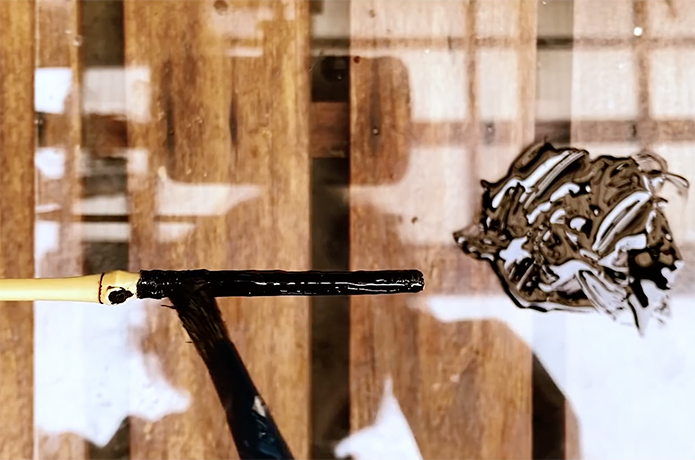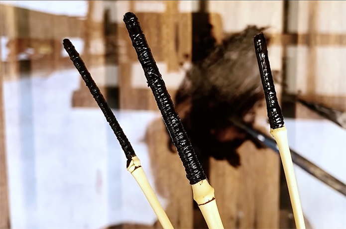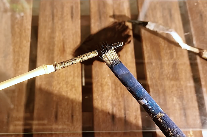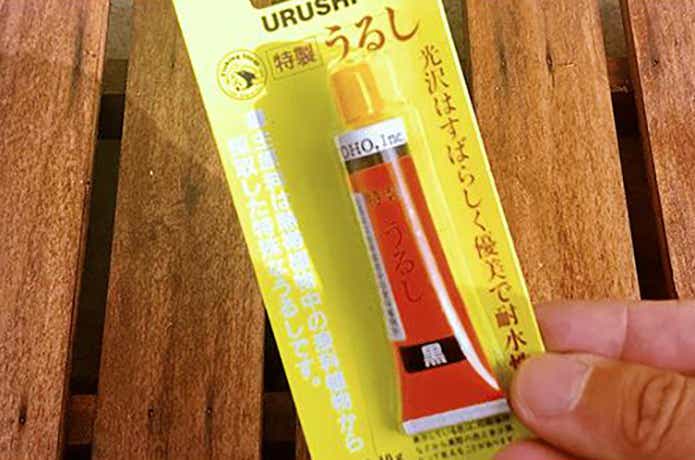 ただし、本漆は高価なうえに乾燥や湿度管理が必要で扱いが難しいため、ここでは特製うるし(カシューナッツの殻から作られた人工漆、いわゆるカシュー)を使用します。