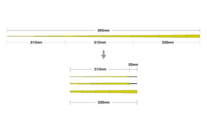 竿先となる細いほうから穂先・穂持・手元と呼びますが、手元を長くする形でカットします。