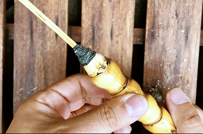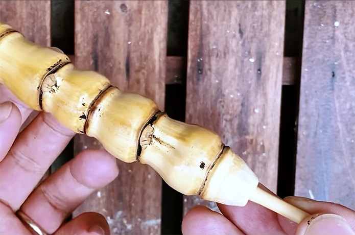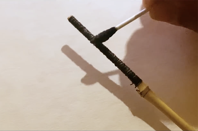握りとなる竹にドリルで穴を開け、竿を差し込み——