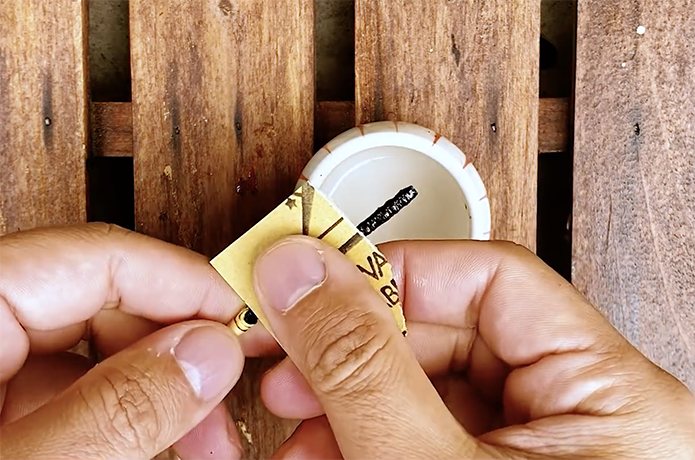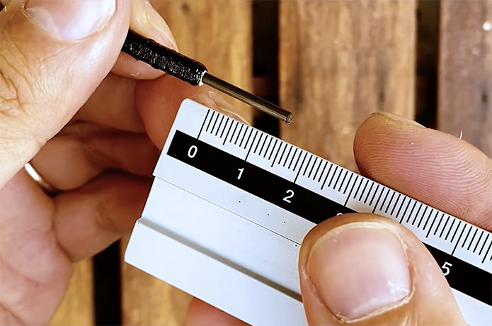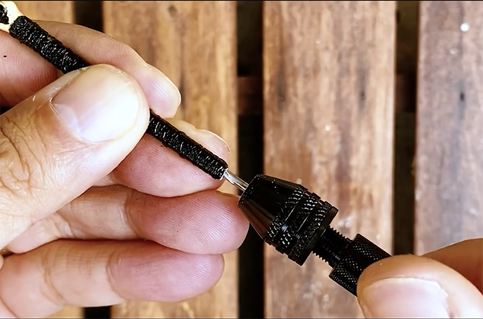 芯と同じ太さのハンドドリルで竹の口巻き部分に穴を開けます。