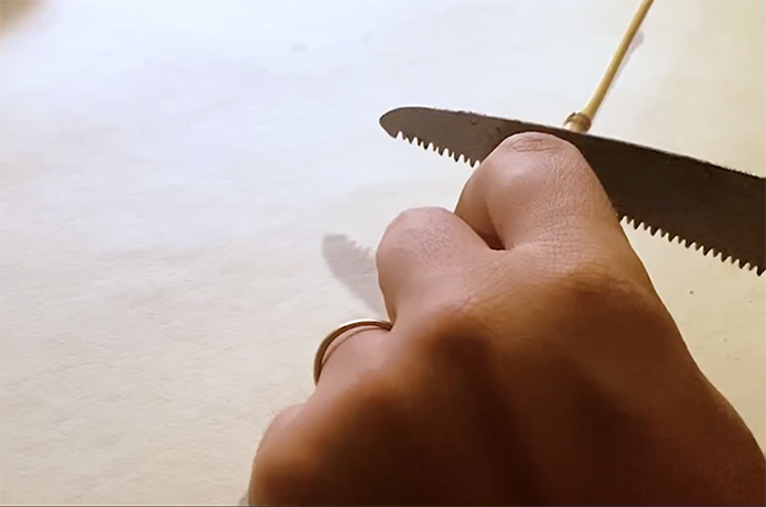 滑らないように糸を巻く部分をナイフで薄く削って、ヤスリがけしてから糸を巻いていきます。