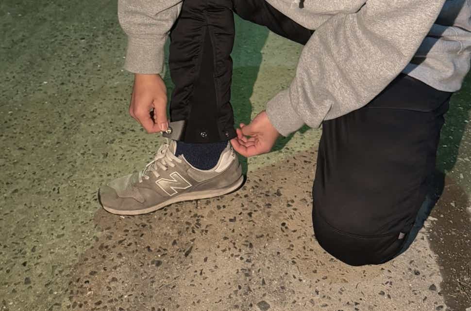 このパンツの裾には2つのボタンが備わっており、裾幅を自在に調整できるようになっています。