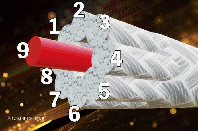 コアインプット製法という、真ん中に芯を持たせた構造のX9は、一般的なPEラインと比べて真円に近いだけでなく、潰れにくいという性質も持っています。