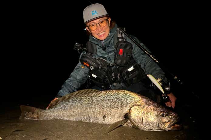 夜の砂ヒラ狙いで入ったサーフでキャッチした、まさかのオオニベ102cm。