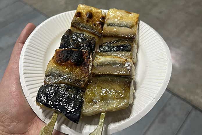 昨年の感動が忘れられず、真っ先に向かったのは「炭火焼ごっつり」のブースです。 オープン直後の空いている時間を狙い、名物のサバ串焼きを無事にゲット。
