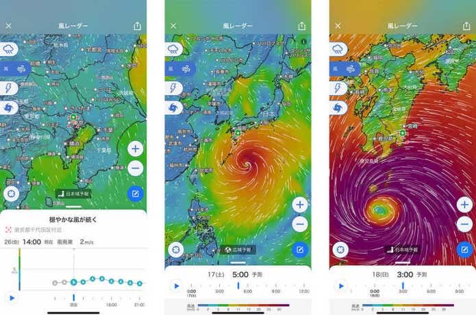風レーダーは、地上ではなく湖上・海上の風の強さを確認できるため非常に有効です。