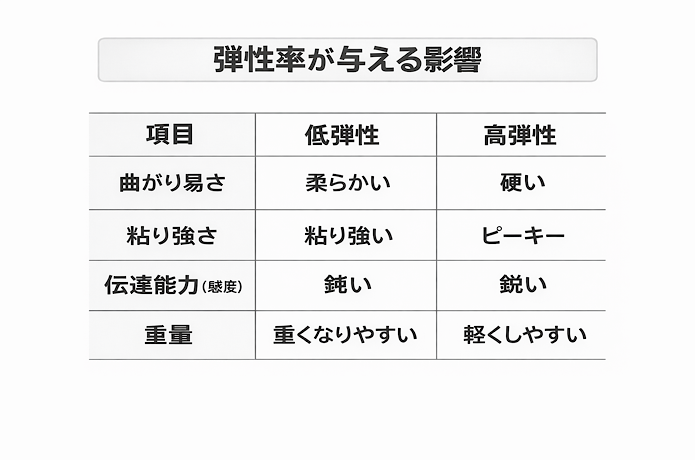 弾性率の違いでロッドの性能に影響を与える要素は大きく4つに分類されます。