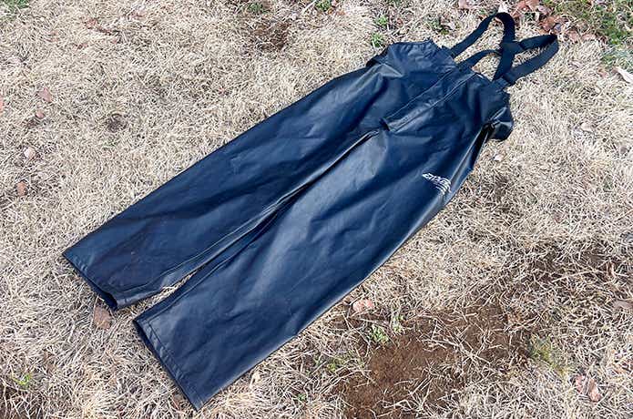 エグゾゼのPUコーティングズボンはサロペットタイプ。