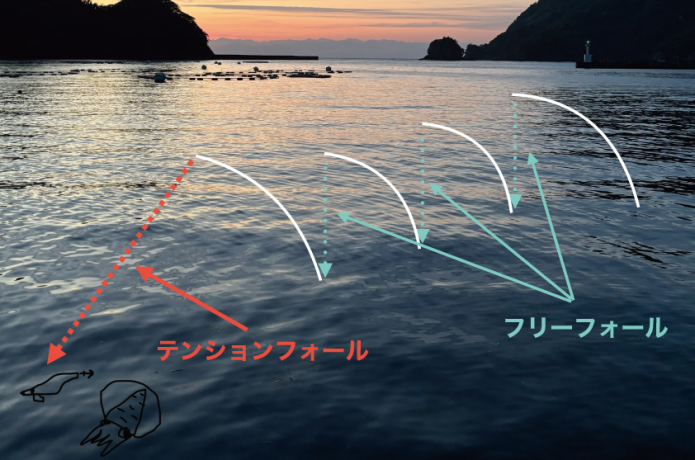 潮の流れが速く、エギがすぐ潮下へ流されてしまう状況では、テンションフォールとフリーフォールの使い分けが重要になります。