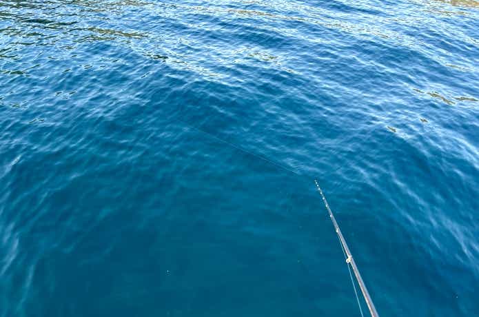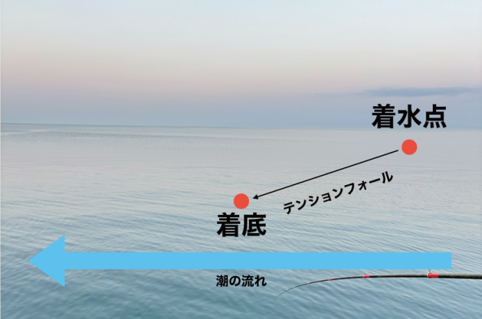 潮の流れが速い場合は、まず潮上にキャストしてテンションフォールで沈めます。