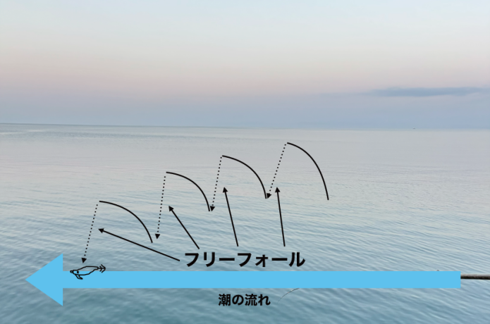 フリーで落とすことで、潮による浮き上がりを抑えつつ、移動距離も最小限にコントロールできます。