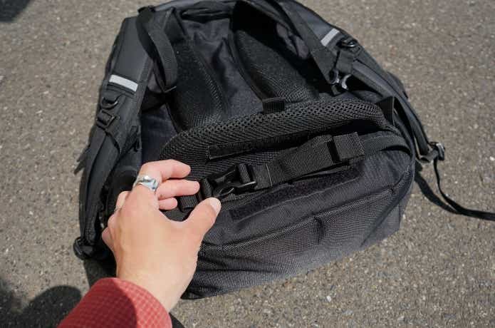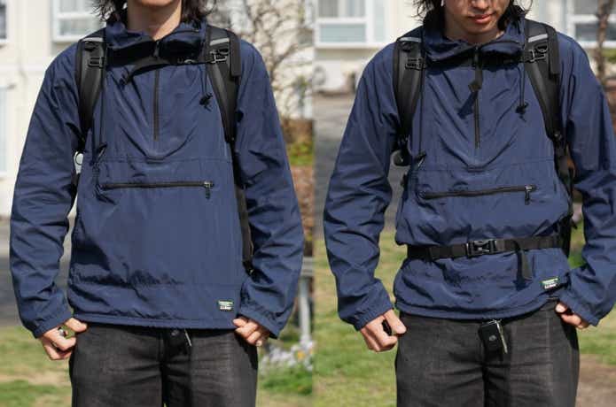 荷物が軽いときやスタイリッシュに背負いたい時には、ウエストハーネスを収納してしまえばブラつくことなく、かなりスッキリ。