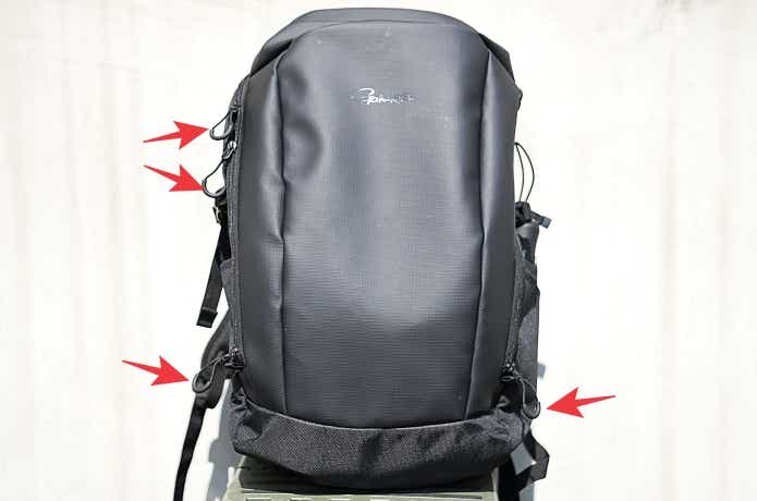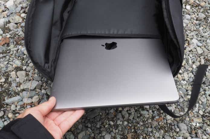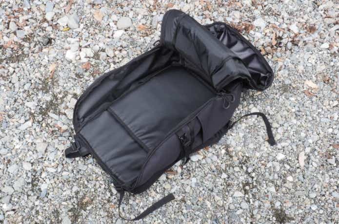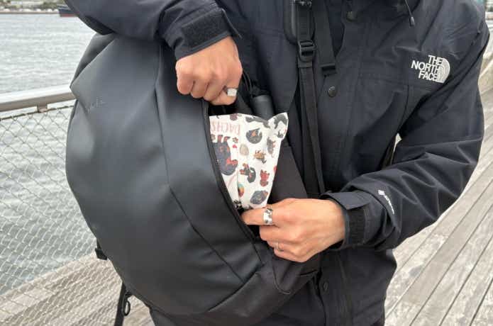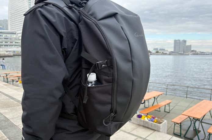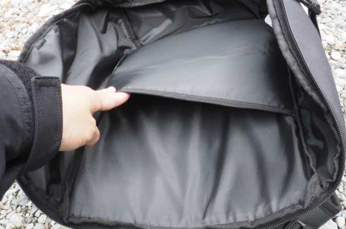 一般的なバックパックは上部から手を入れる構造のため、底の方に入れた荷物が取り出しづらかったりするんですが、このバックパックはサイドファスナーのおかげで底面付近へのアクセスもスムーズに。