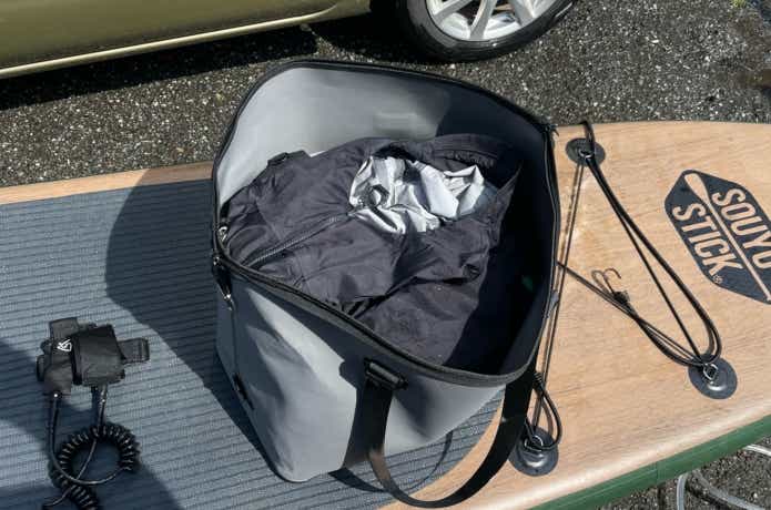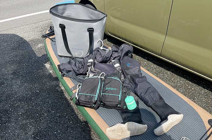 僕はSUPフィッシングで使用することが多いですが、釣り中は水面が近くて潮水もバンバン被るので、濡れ物や汚れ物がめちゃめちゃ出るんですよね。