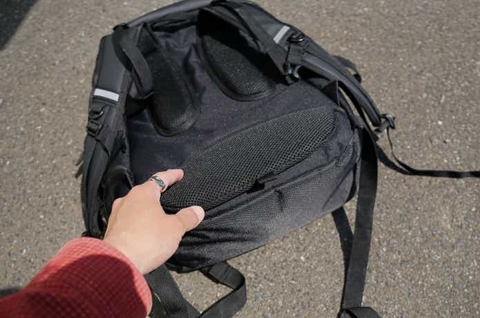 背面は、背中に当たる部分にメッシュ素材のクッションが入っています。