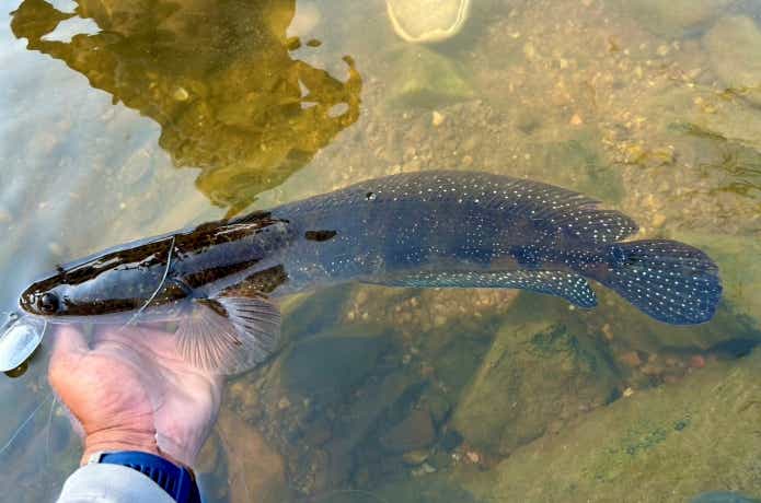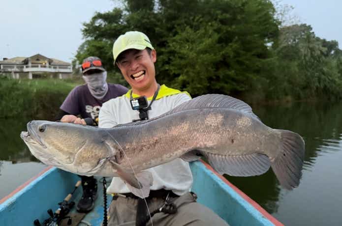 イムランとの釣行で釣り上げたブルズアイスネークヘッドことマルリウス。地域ごとにさまざまなバリエーションがあることから、この川の個体も釣ってみたいとリクエストしました。