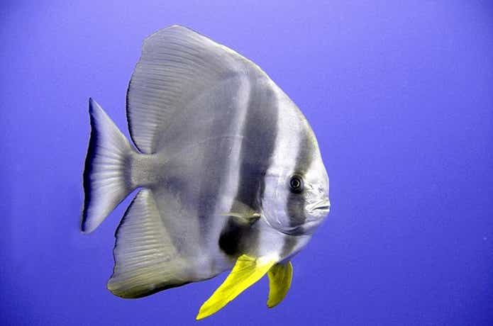 ツバメウオは、体高が高く扁平な姿が大きな特徴。特に背びれと臀(しり)びれが上下に大きく伸びており、独特の姿形をなしています。日本の沿岸部で見られる成魚は、大抵40センチ程度までですが、沖合では最大で1メートルにまで成長することもあります。