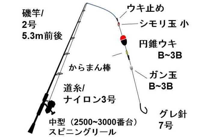 メイチダイを狙うときにはウキを使ったフカセ釣りが良いでしょう。オレンジやグリーンの見やすい色をした円錐ウキに浮力や仕掛けの沈みを調整するガン玉、メジナ用のグレ針7号前後のものを使ってみてください。