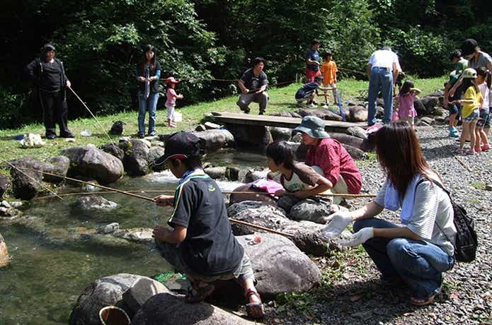 ヒスイ峡フィッシングパークは、人工の渓流に川の流れを引き込んだ、小さなお子様連れの家族でも安全に釣りを楽しめるスポットです。釣れるのはイワナ・ニジマス・ヤマメとどれも美味しい魚で、その場で焼いて食べることができます。夏と秋には釣りだけでなく、魚のつかみどりや美味しいものが揃うバザーも行っていますので、ぜひ家族で足を運んでみてください。