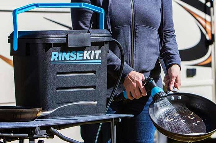 リンスキットの加圧式簡易シャワーは、ホースやシャワーヘッド、タンクを持ち運びやすくしたアウトドアに最適なアイテムです。ブラック/ホワイトの2カラーがラインナップ。