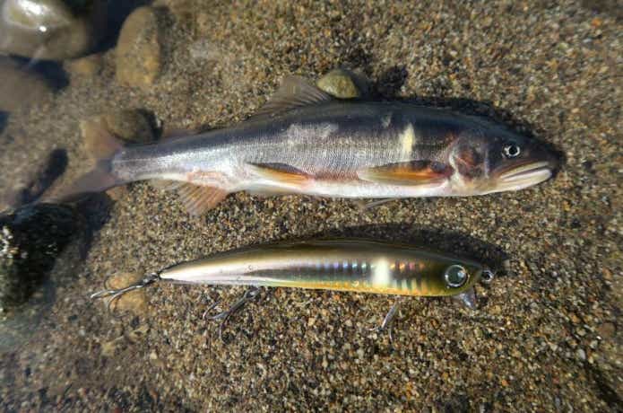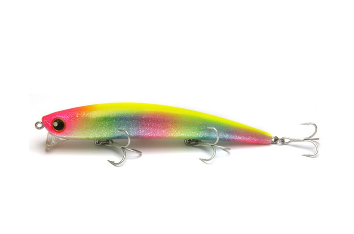 120ミリ、20グラムのモデル。潜行深度は水面直下より60センチ。このレンジであれば潮による干満に対応することが出来き、多くのシチュエーションで使う事が可能です。感度の良いルアーなので潮の変化を感じ取り易く、シャローゲームでフィールドの状況を把握しやすいルアーです。
