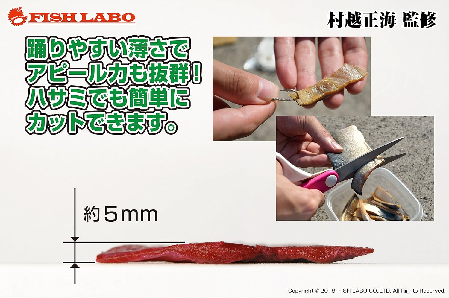 厚みは約5ミリ。針にチョン掛けするだけで、水中で魅力的に動いて魚にアピールします。幅広に使ってもよし、細く切って房掛けでアピール力を増すのもよし、と用途が広がるのもウレシイところ。