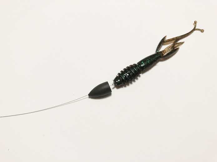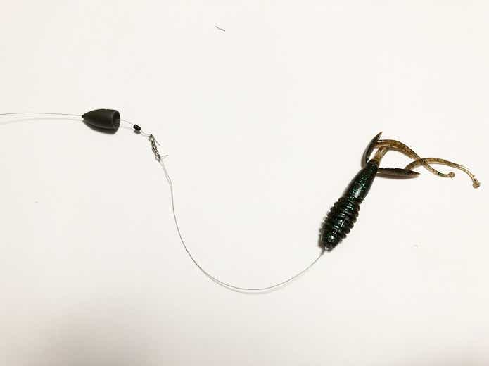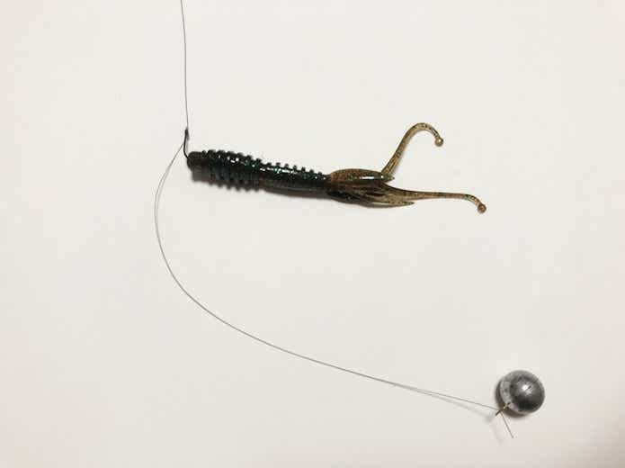 ボトム付近を狙う場合はダウンショットリグがおすすめ。着底させてテンションを抜けばノーシンカーのようにもなるため、フワッと跳ねたエビのように見せることができます。また、場所を動かすことなくピンポイントを狙うことも可能なので、障害物回りなどを狙い撃ちする際にも威力を発揮します。