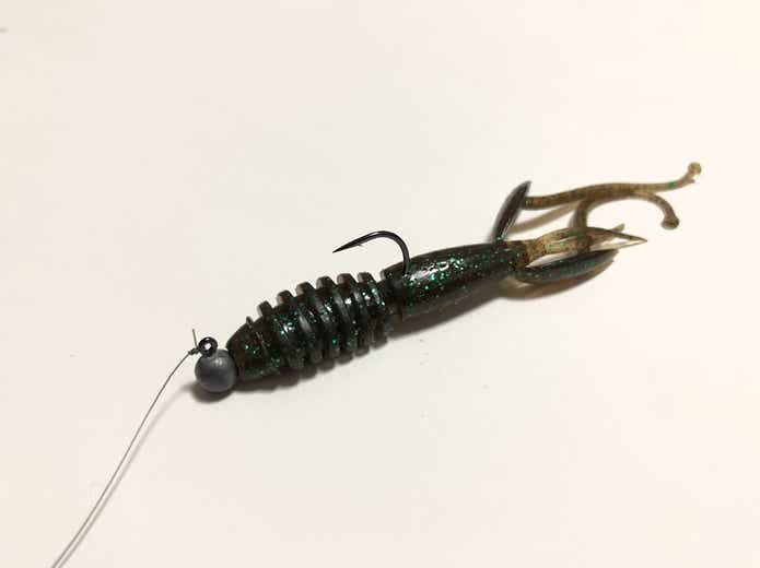 ボトムに障害物が少ない場面ではジグヘッドリグもおすすめ。1グラム程度の軽めのジグヘッドを使い、ナチュラルなフォールでバイトを誘います。ボトムを丁寧に探り、まるでエビが歩き回っているように見せるのも有効です。