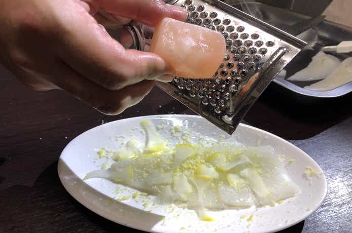 おろし器を使って冷凍レモンを削りましょう。皮ごとおろすことで、香りと風味が増幅します。スライス状にしてもおしゃれですよ!