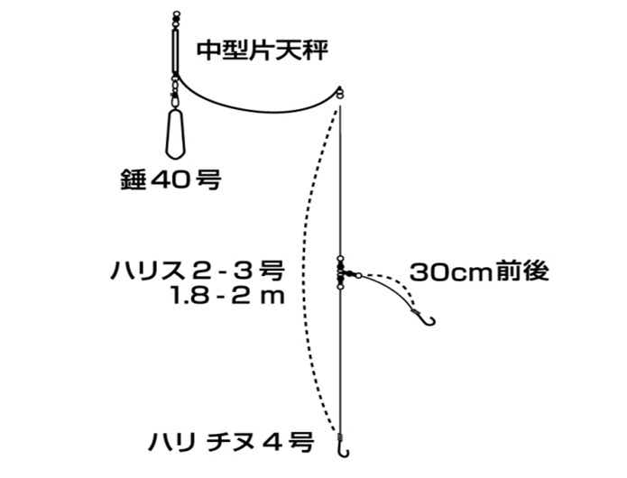 カナガシラを釣る場合、底をとりやすい片テンビン仕掛けがお勧めです。ハリスはフロロカーボンで2ヒロほど取ると底を丁寧に狙うことが出来るでしょう。